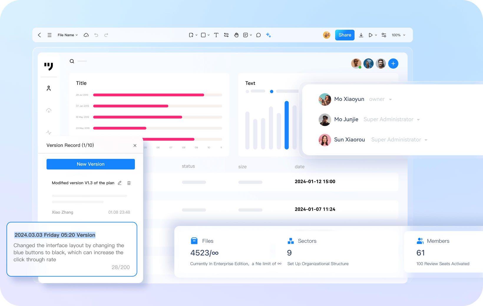 Mockitt supports manual and automatic creation of version logs, unlimited historical versions of files, cloths, pages and team spaces, allowing users to easily view, compare and restore different versions to ensure data security